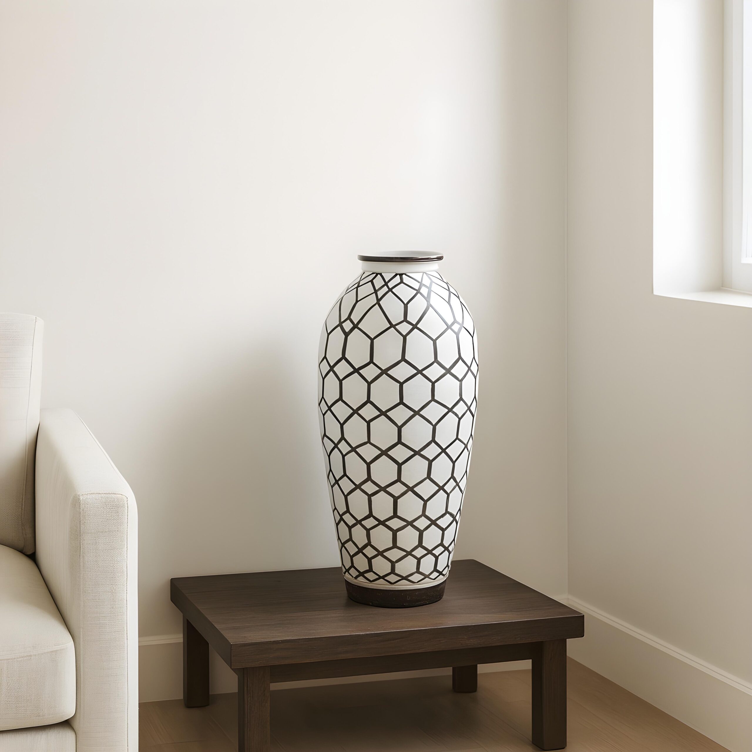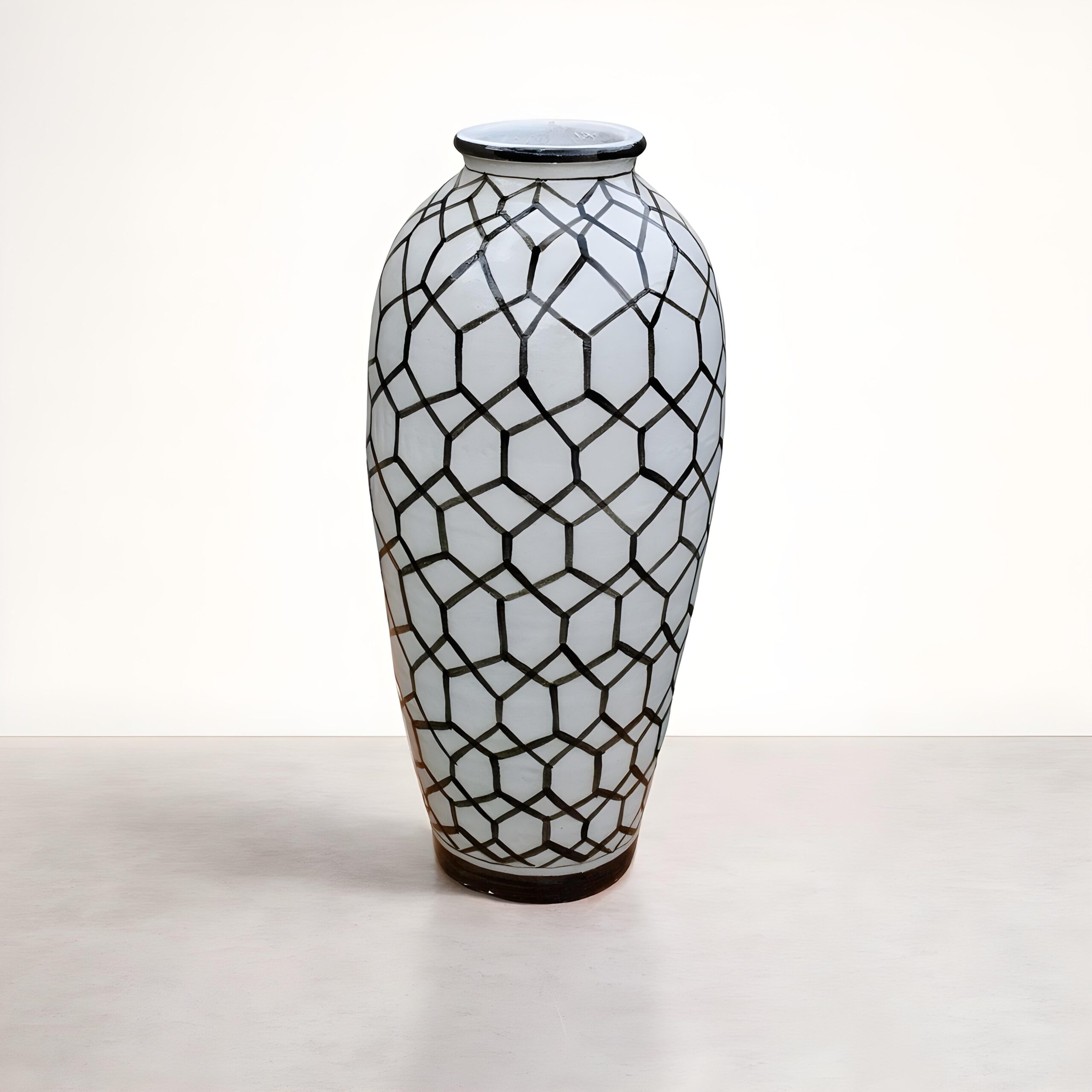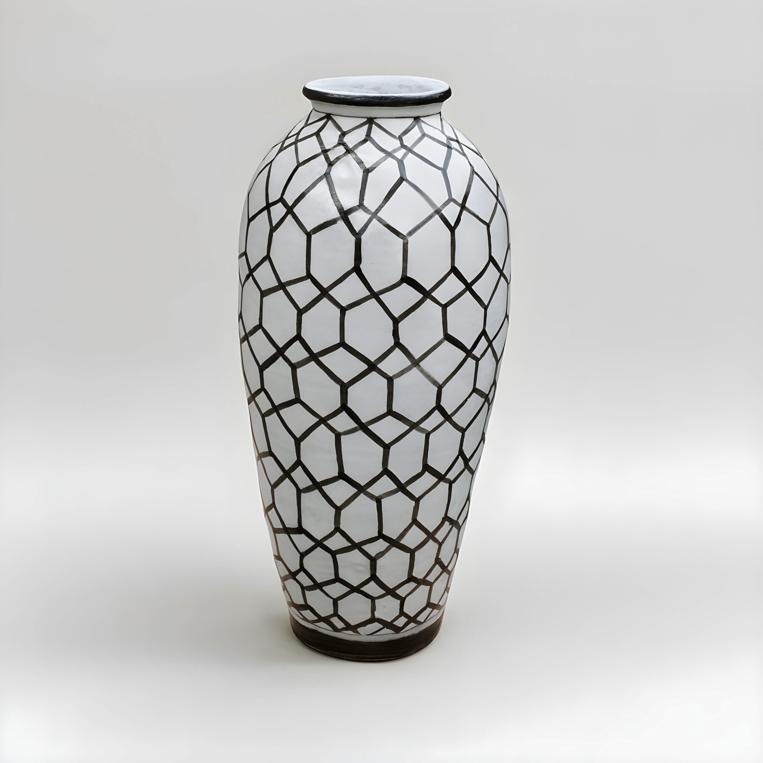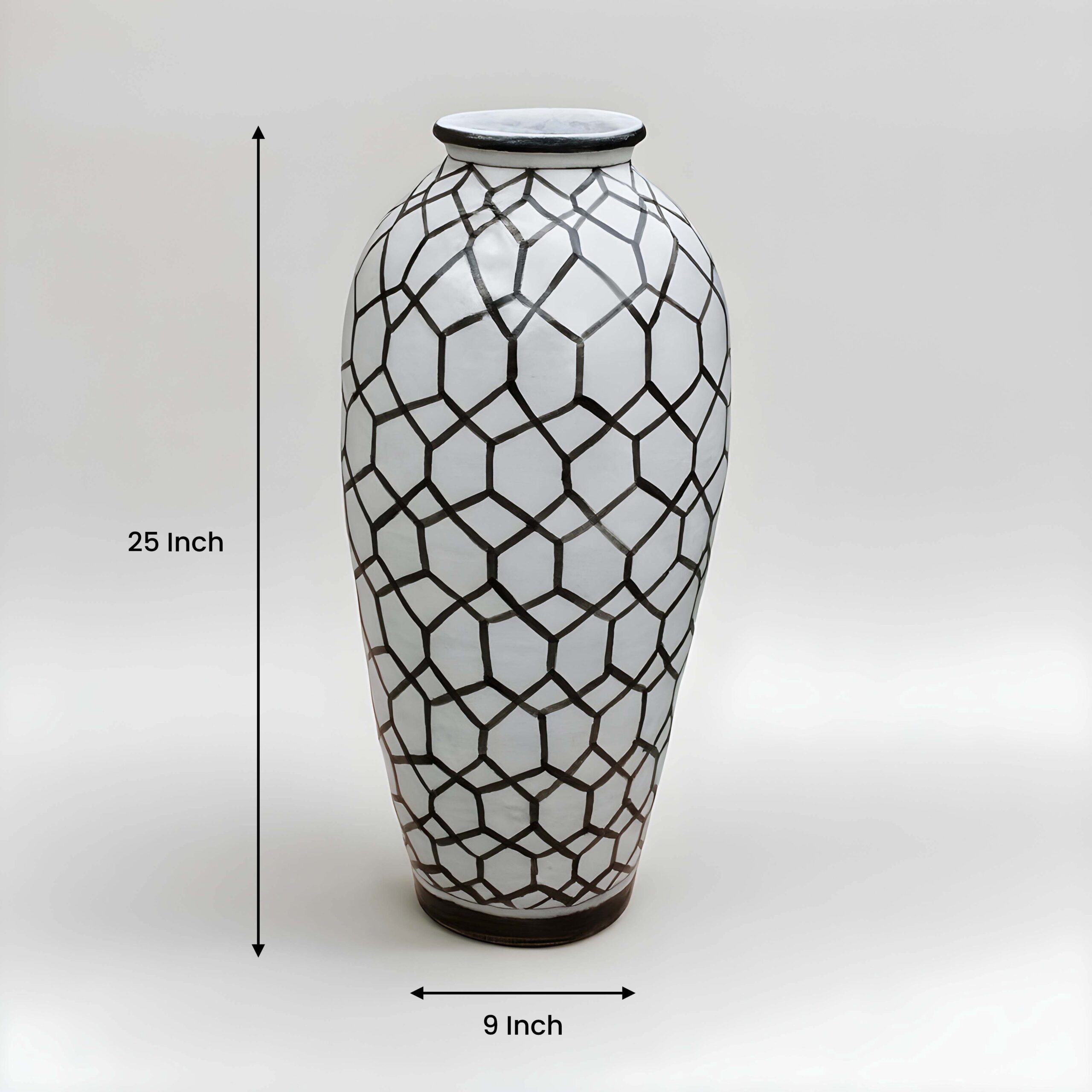 Each vase is carefully handmade from strong ceramic, giving it a solid and elegant shape. The surface is covered in a striking hand painted geometric pattern of black hexagons, creating a honeycomb effect that instantly catches the eye. The dark rim and base frame the design beautifully, making it a complete work of art.