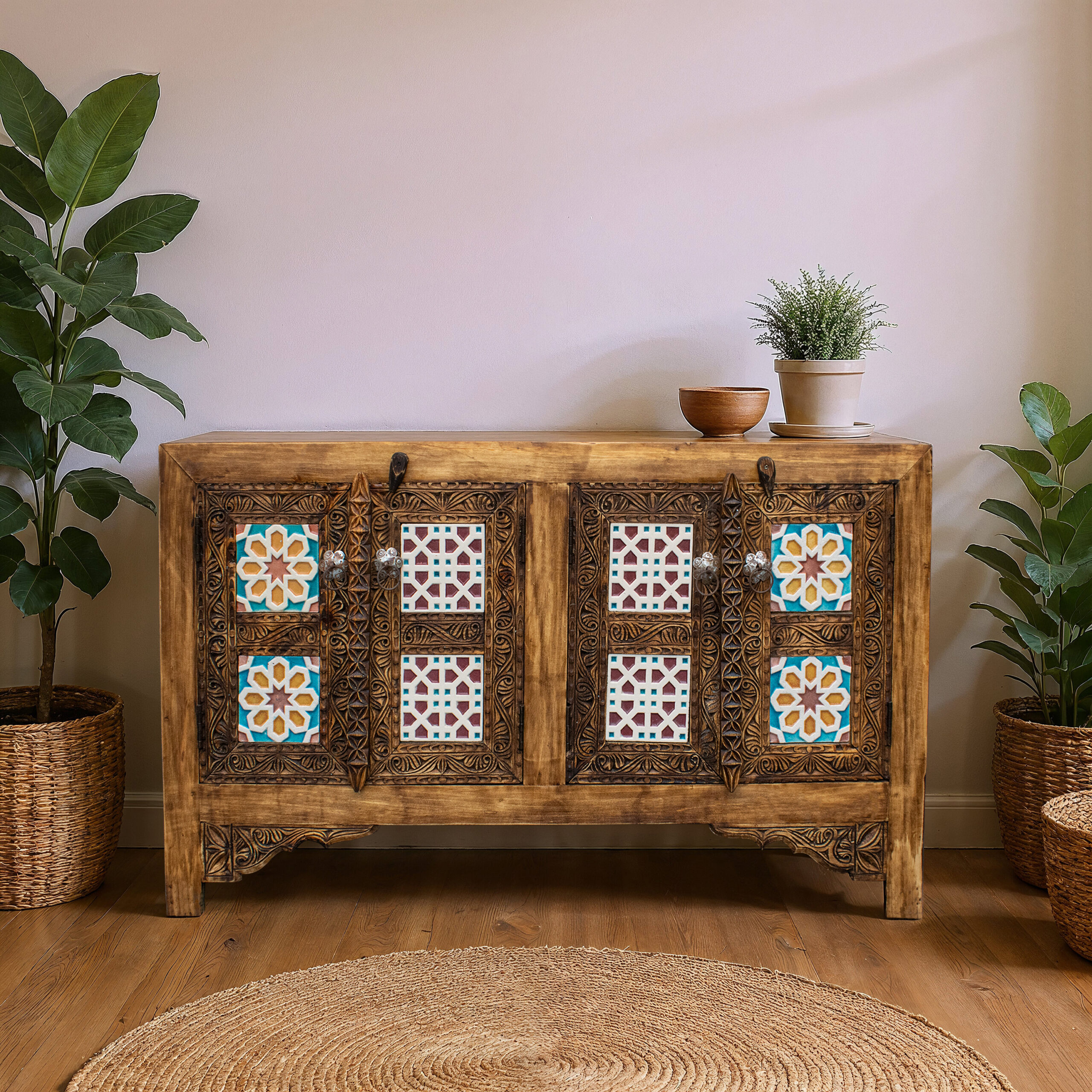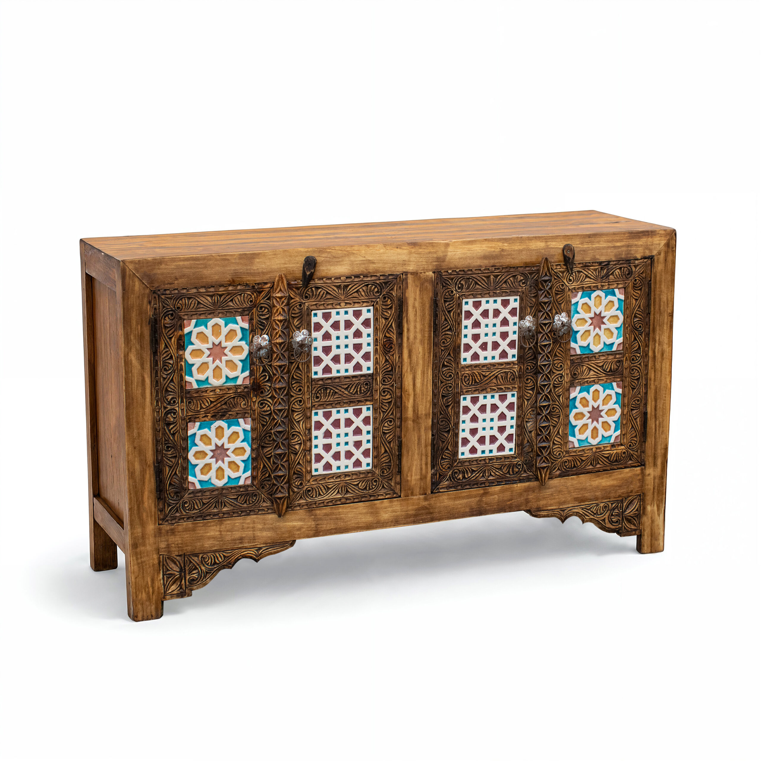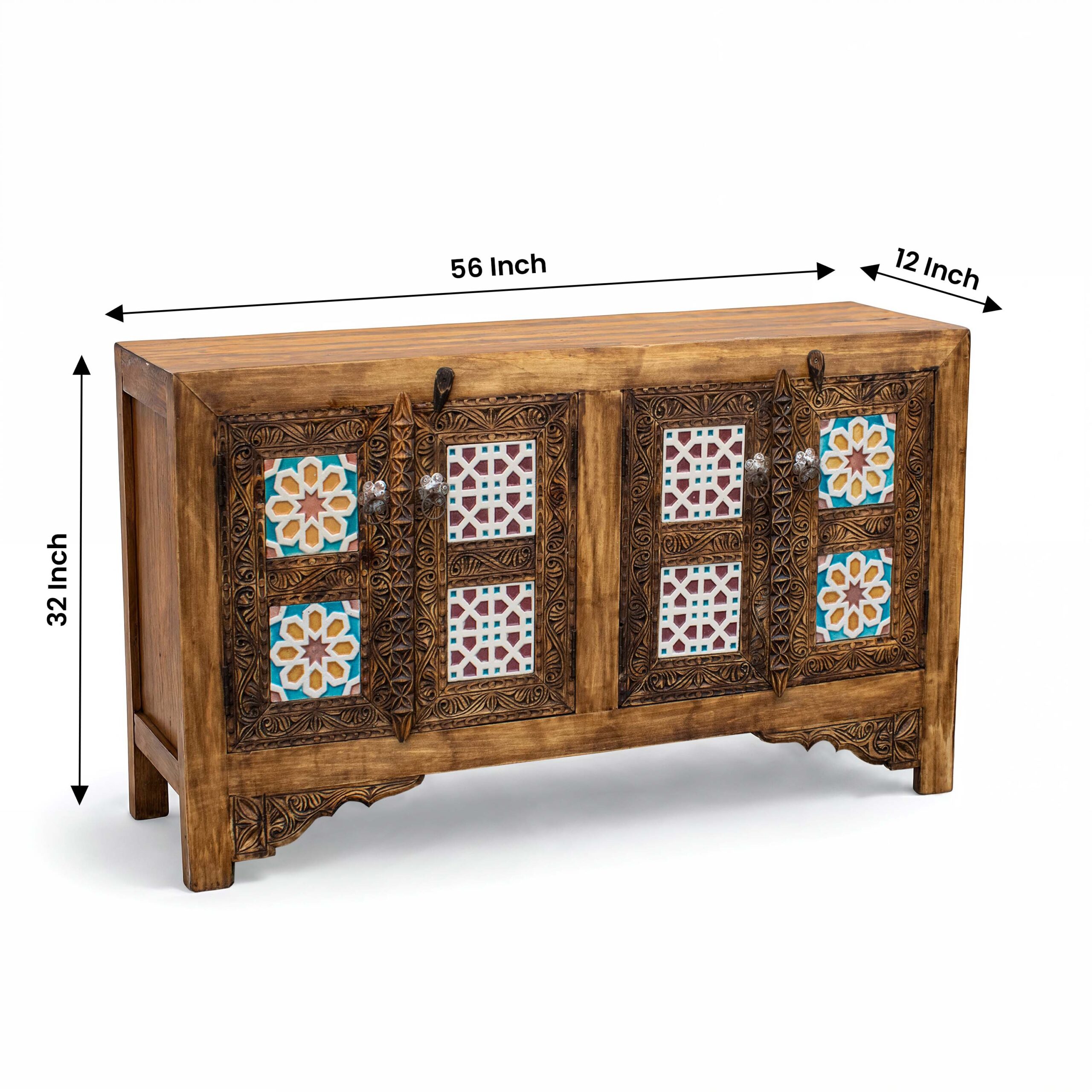 Made from strong, ethically sourced natural Cedar Wood, this piece is built to last and designed to impress. It is perfect for the modern & luxury home. Our talented artisans carve every detail by hand, making each wooden cabinet a unique work of art. The doors feature beautiful tiles in bright blue and turquoise colors, inspired by classic Moroccan style. This colorful design looks stunning against the dark, rich wood. This cabinet is more than just storage; it’s a statement piece. The elegant, gold-colored handles and metal details add a final touch of class.