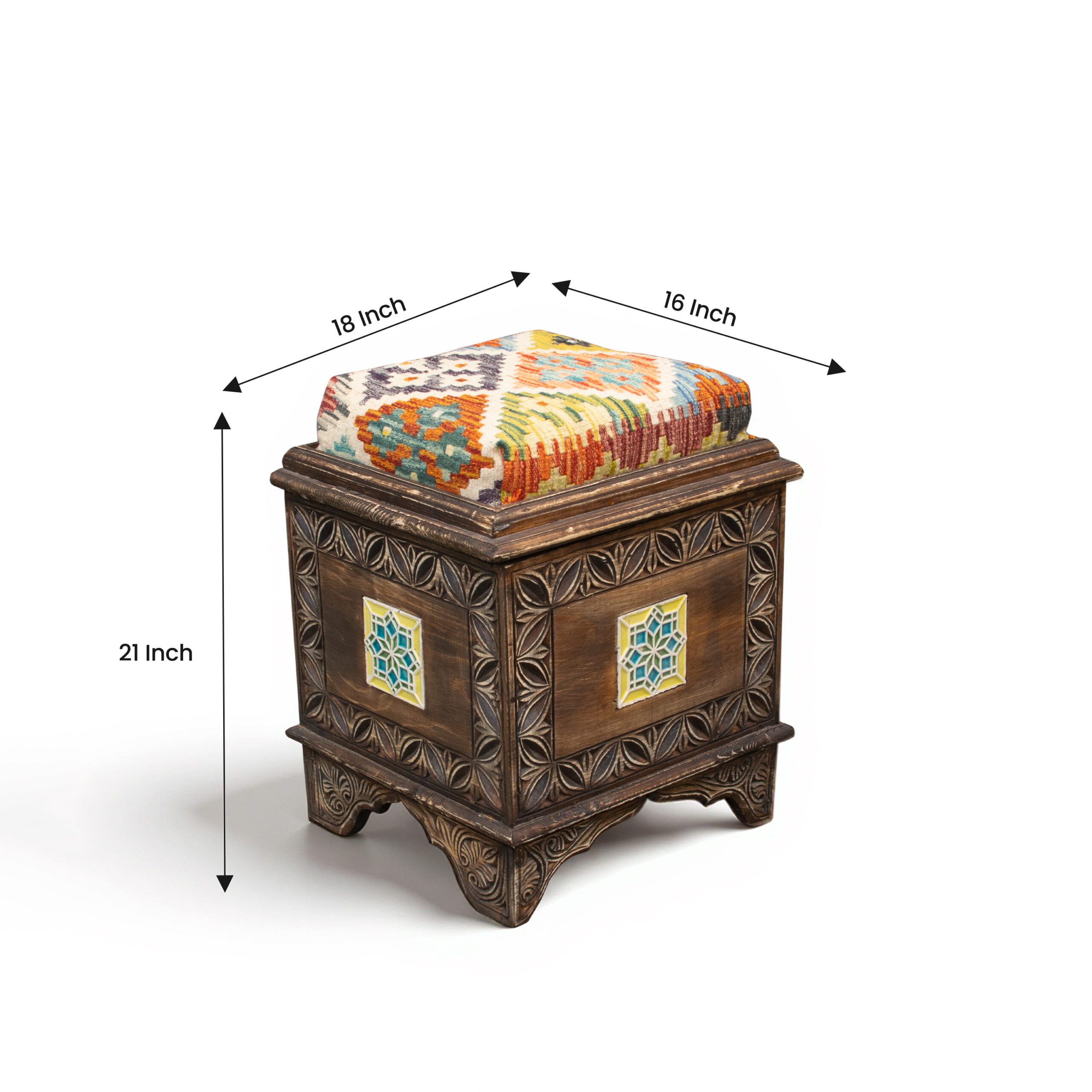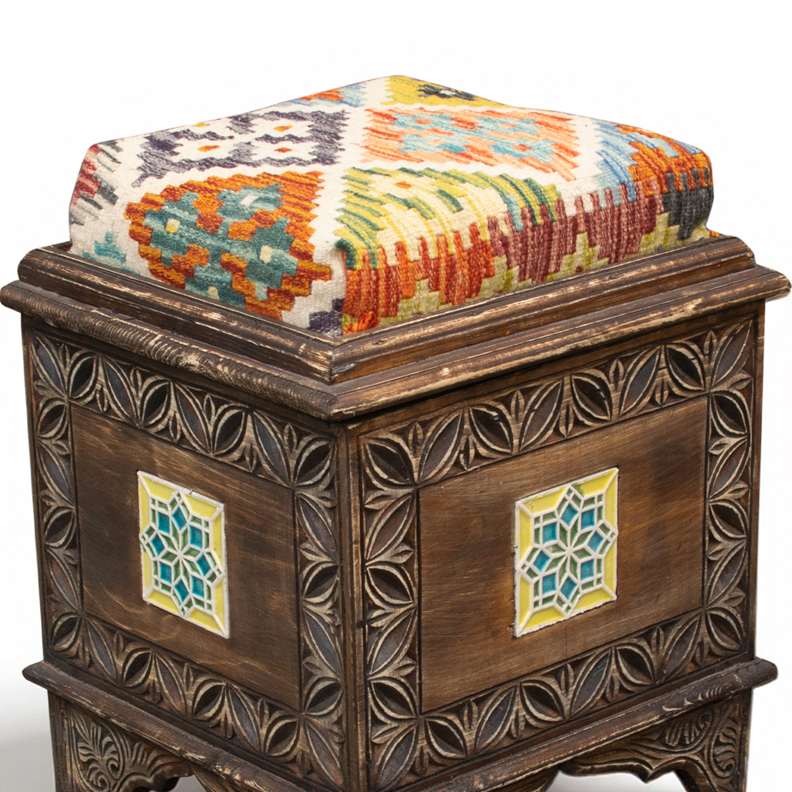 Hand-Carved Wooden Storage Stool With Kilim Upholstery WB-1019
