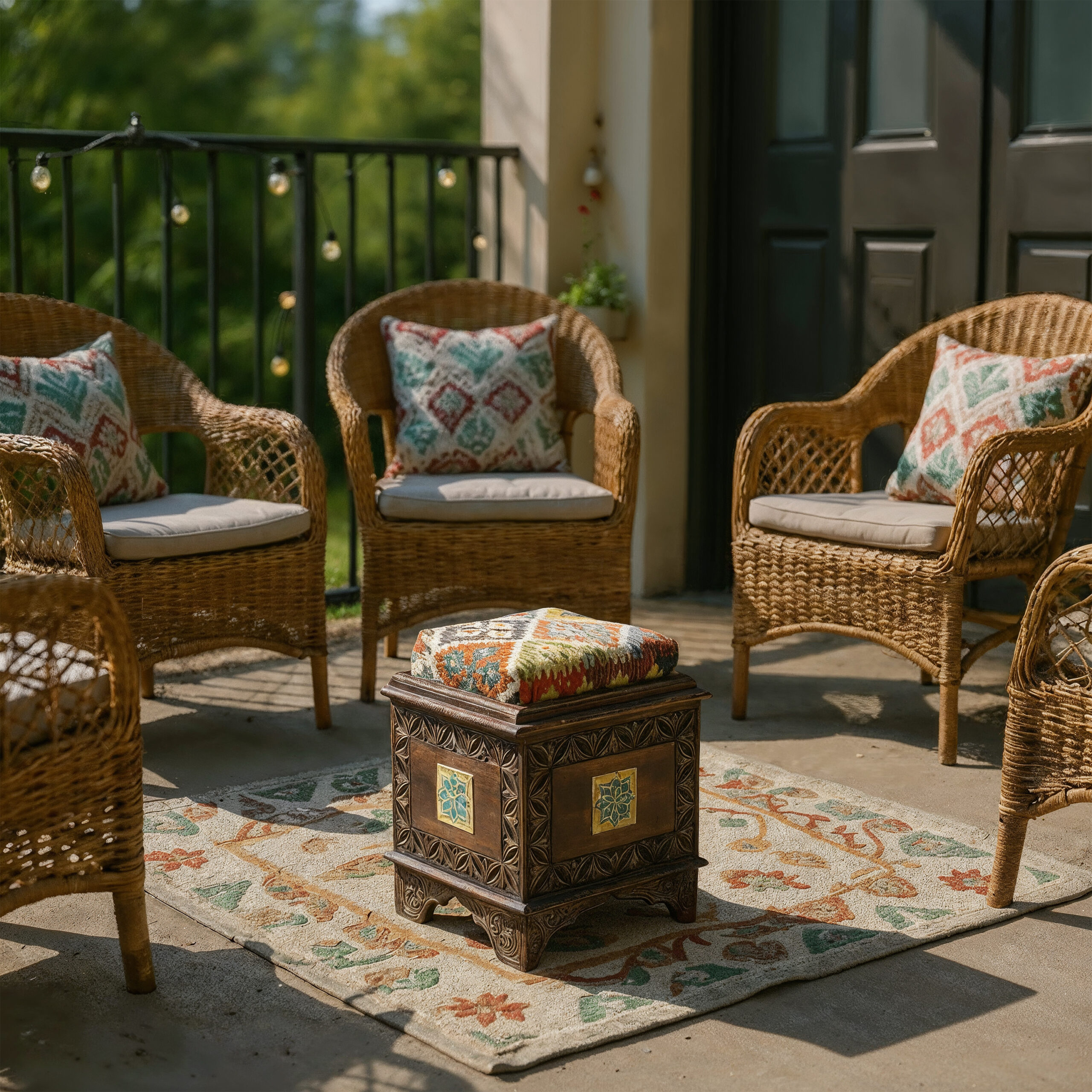 Made from strong, ethically sourced natural wood, this piece is built to last and designed to impress. It is perfect for the modern & luxury home. Our talented artisans carve every detail by hand, making each stool a unique work of art. The solid wood frame features detailed carvings and is accented with small, colorful tiles for a touch of classic style.