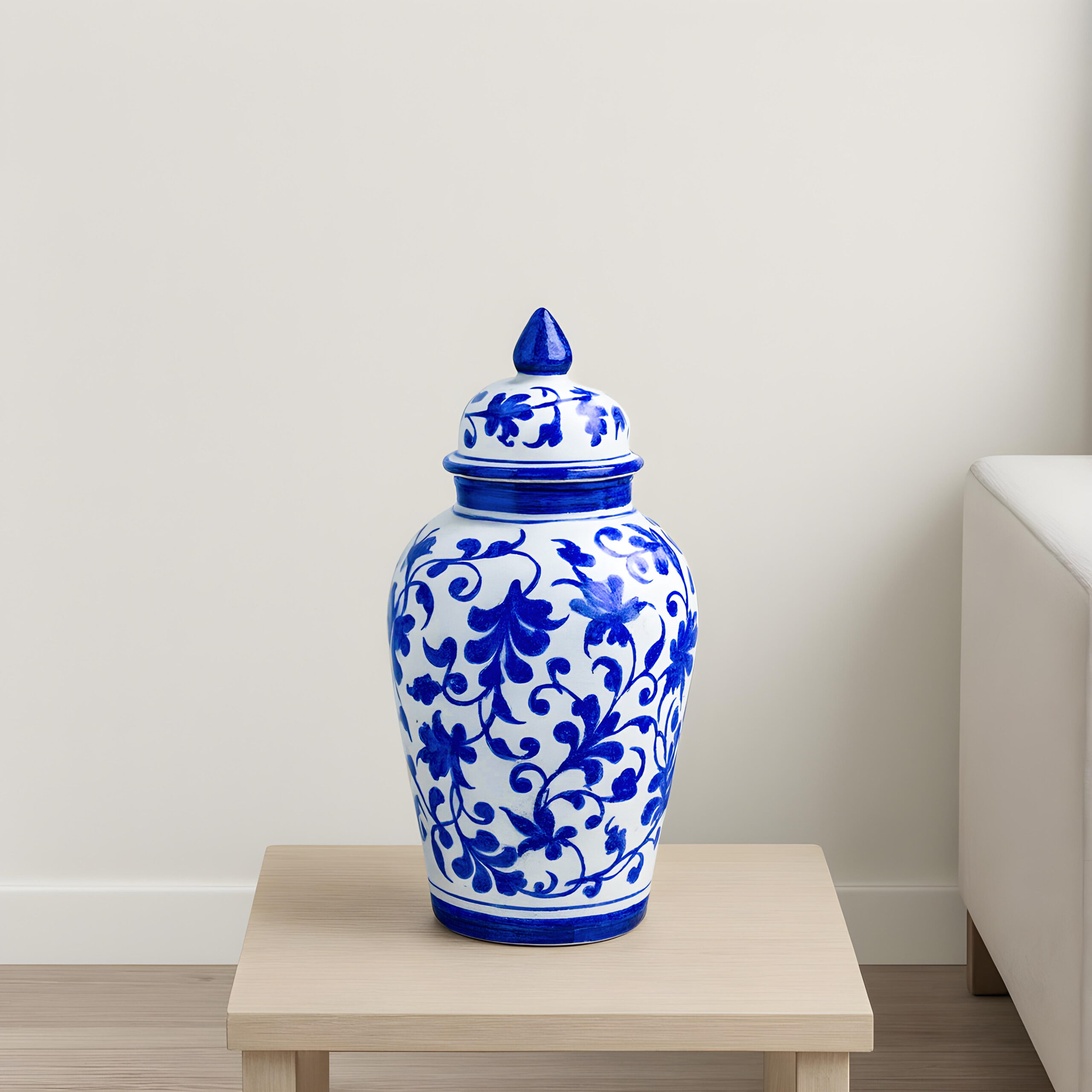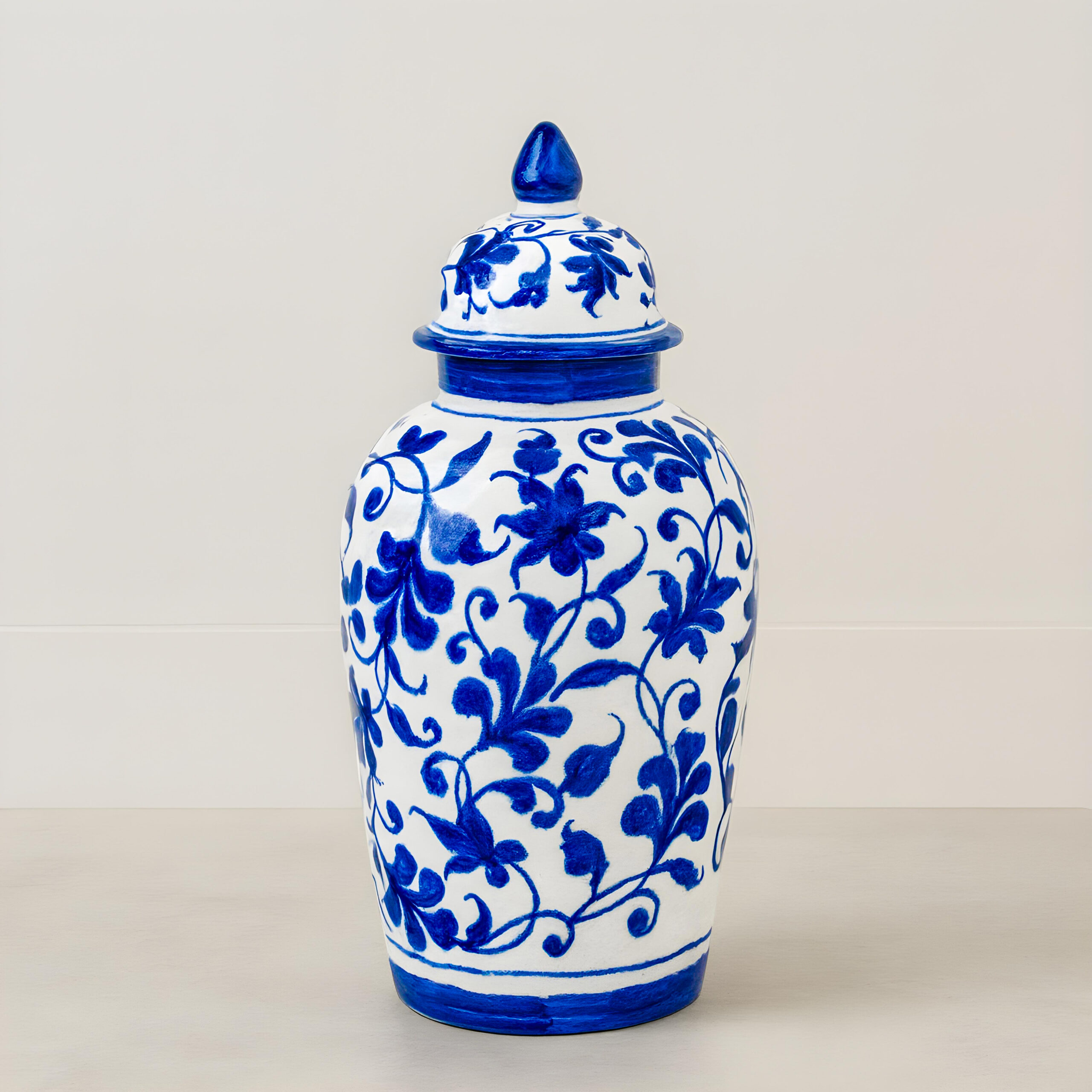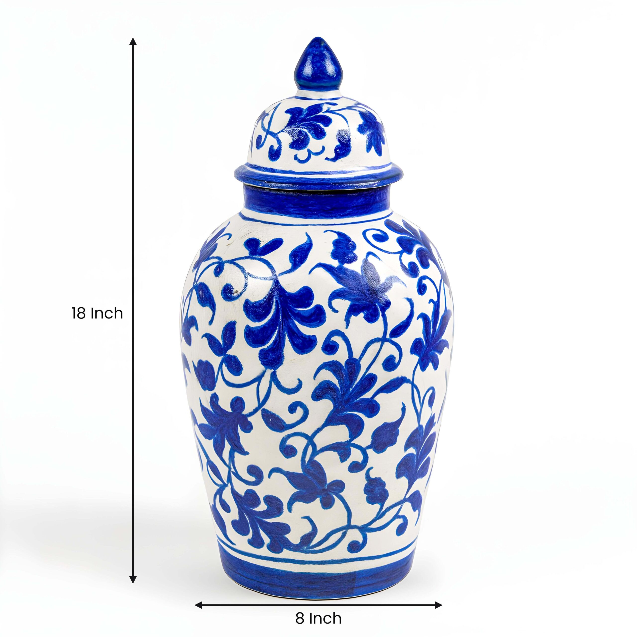 Each jar is carefully handmade and then hand painted by skilled artisans. The surface is decorated with flowing vine and leaf patterns in bright cobalt blue on a clean white background. Confident brushstrokes make every jar unique. A matching lid with a pointed finial completes its traditional and elegant shape.