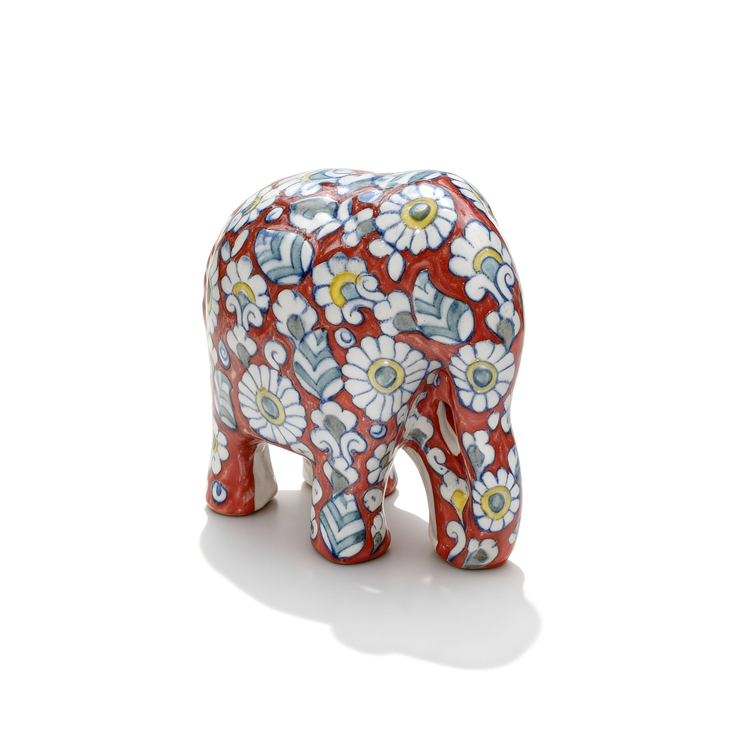 Made from high-quality, natural clay, this piece is built to last and designed to impress. It is perfect for the modern & luxury home. Our talented artists shape and paint every elephant by hand, making each one a unique work of art. The ornament is covered in a beautiful pattern of white and yellow daisies against a warm red background, with delicate leaf details.