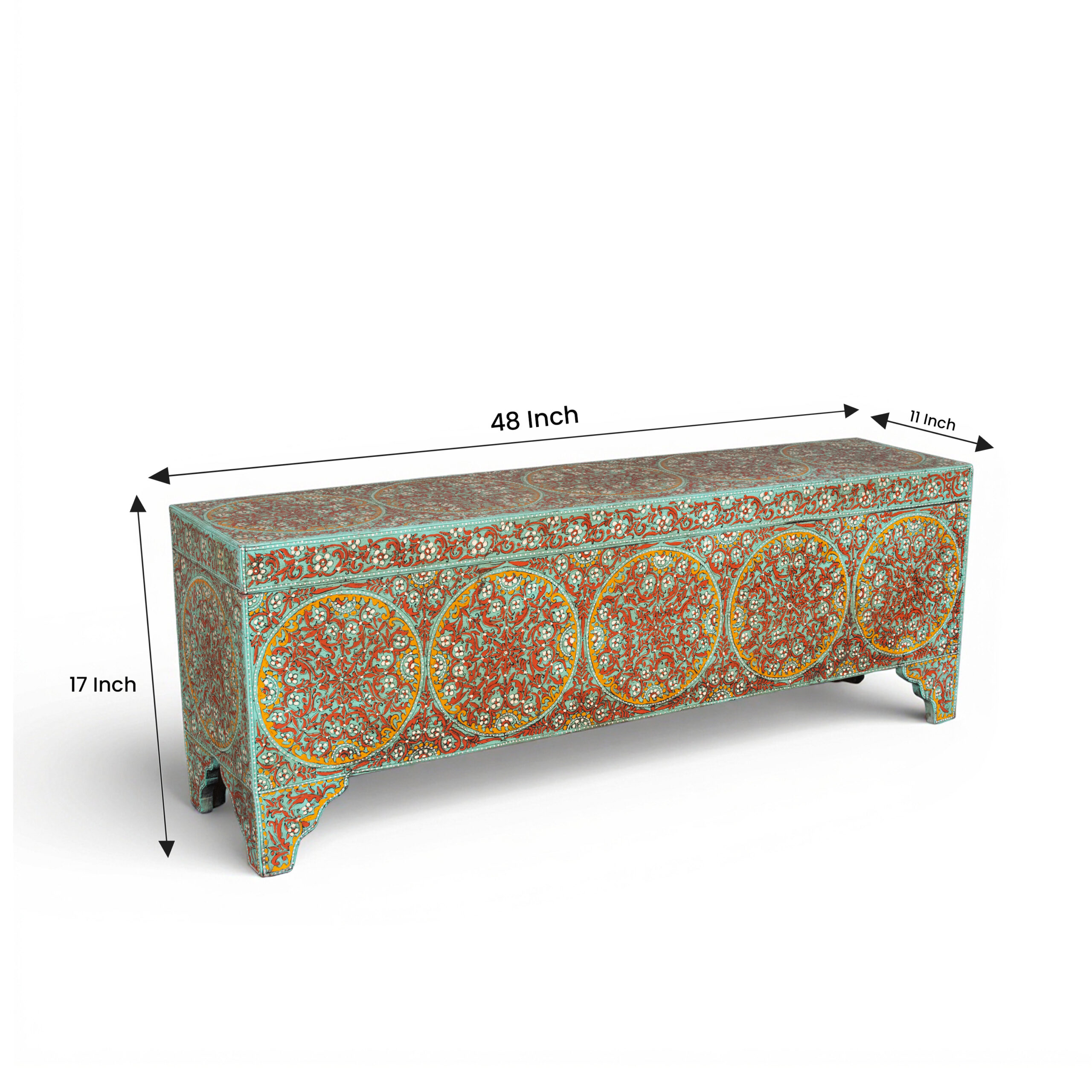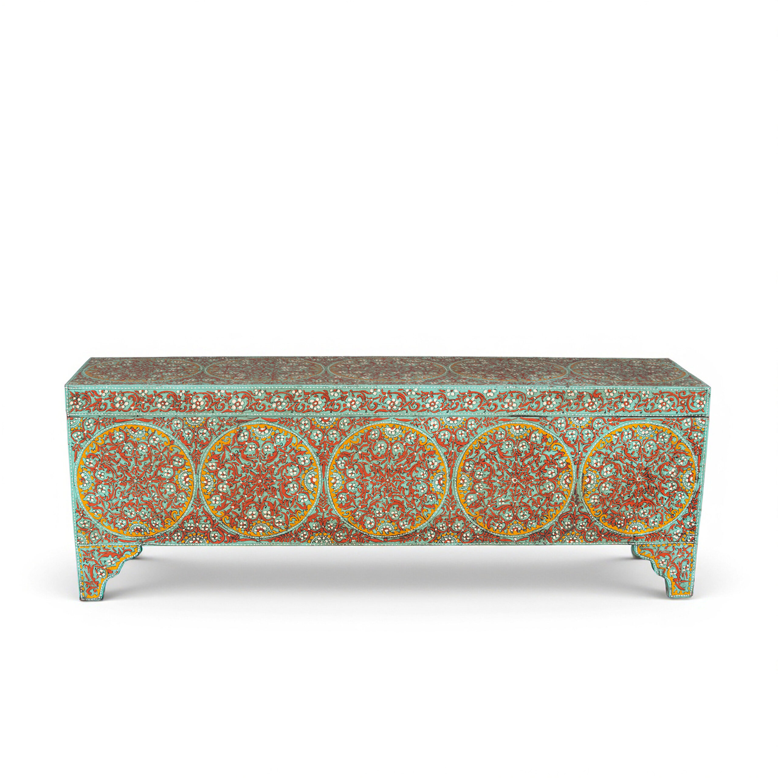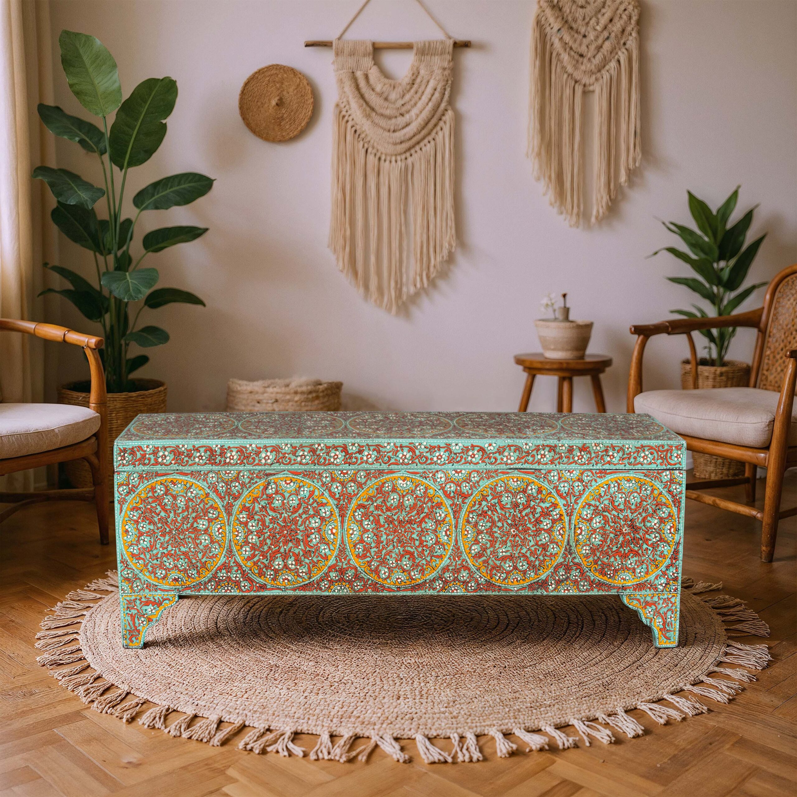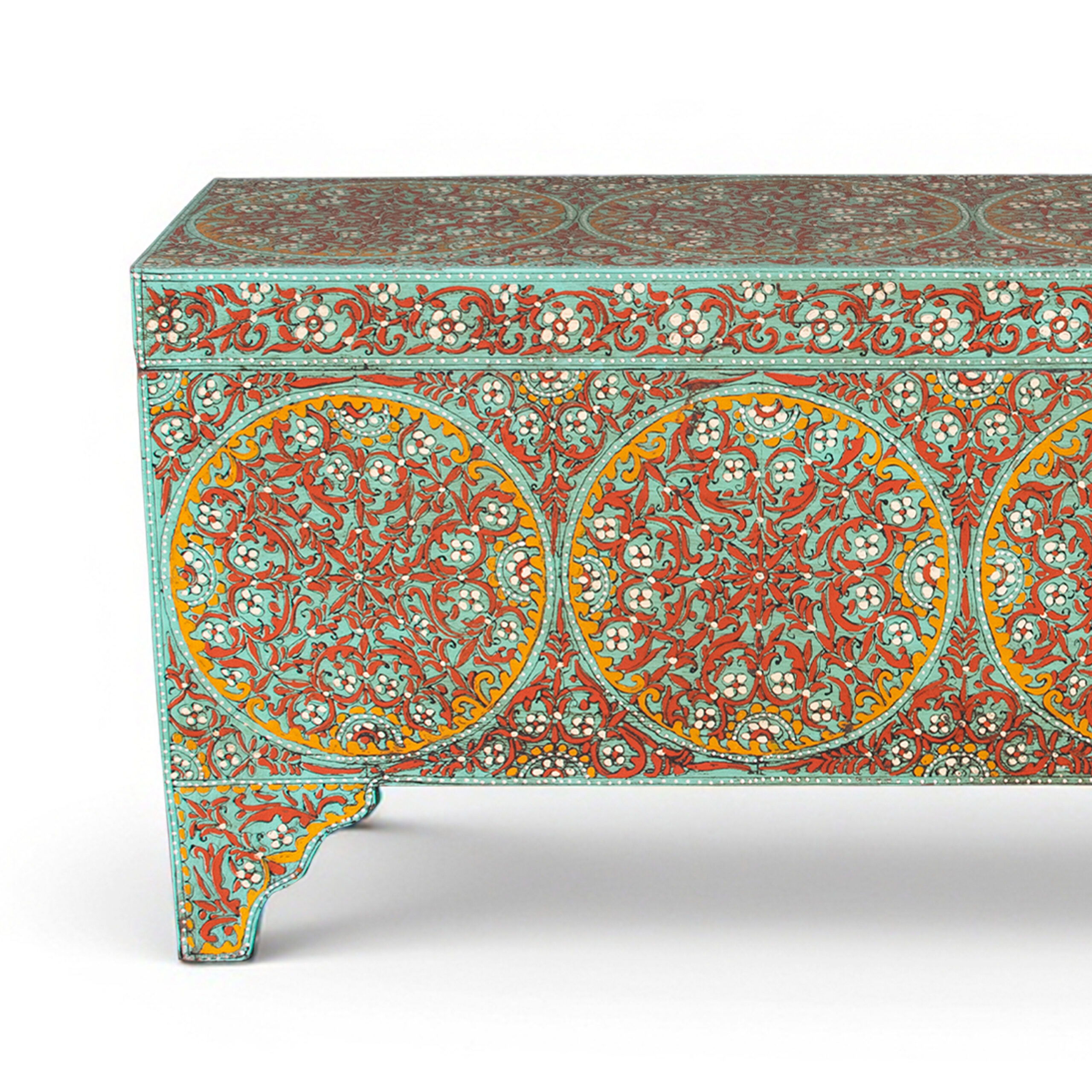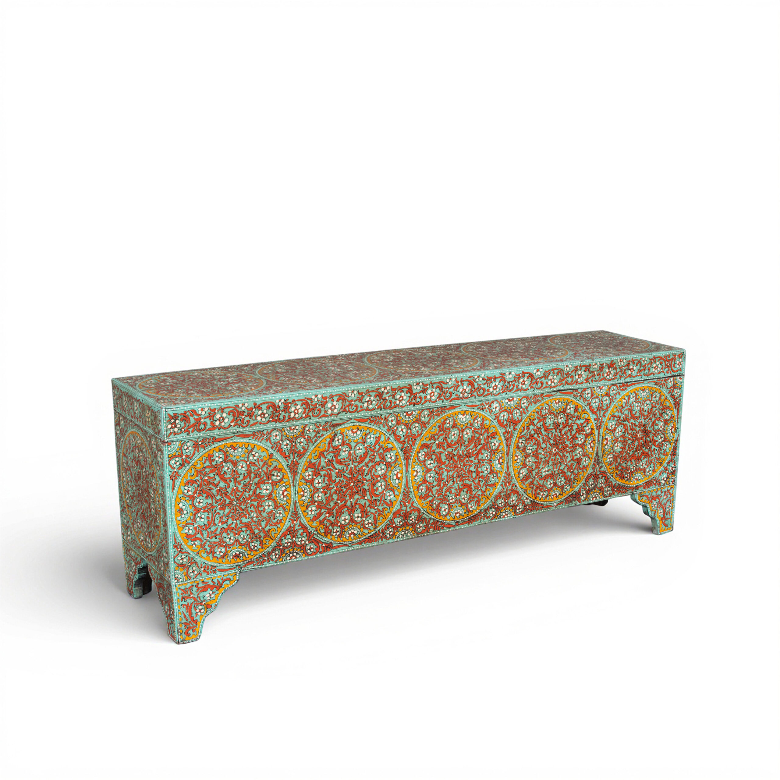 Made from strong, ethically sourced wood, this piece is a true masterpiece, built to last and designed to impress. It is perfect for the modern & luxury home. Our most talented artists spend countless hours painting every detail by hand, making each chest a unique and collectible work of art. The entire surface is covered in incredibly fine and intricate floral patterns, reminiscent of classic Persian manuscript art.