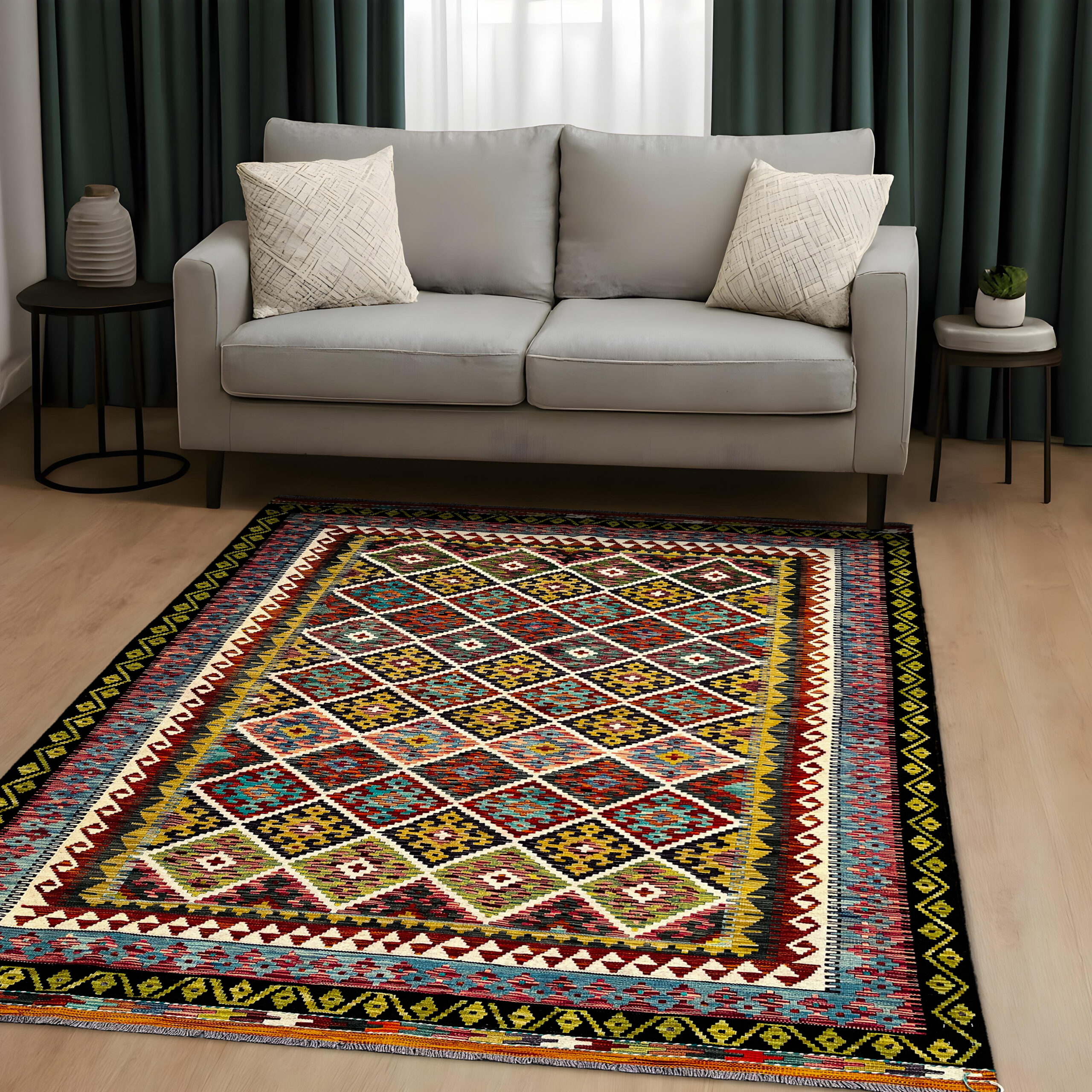 Bring the beauty of Afghan culture into your home with our Handwoven Afghan Kilim. Each piece is carefully made by skilled artisans with love, patience, and tradition. These rugs are more than just floor coverings they carry stories of heritage and beauty, passed down through generations.