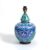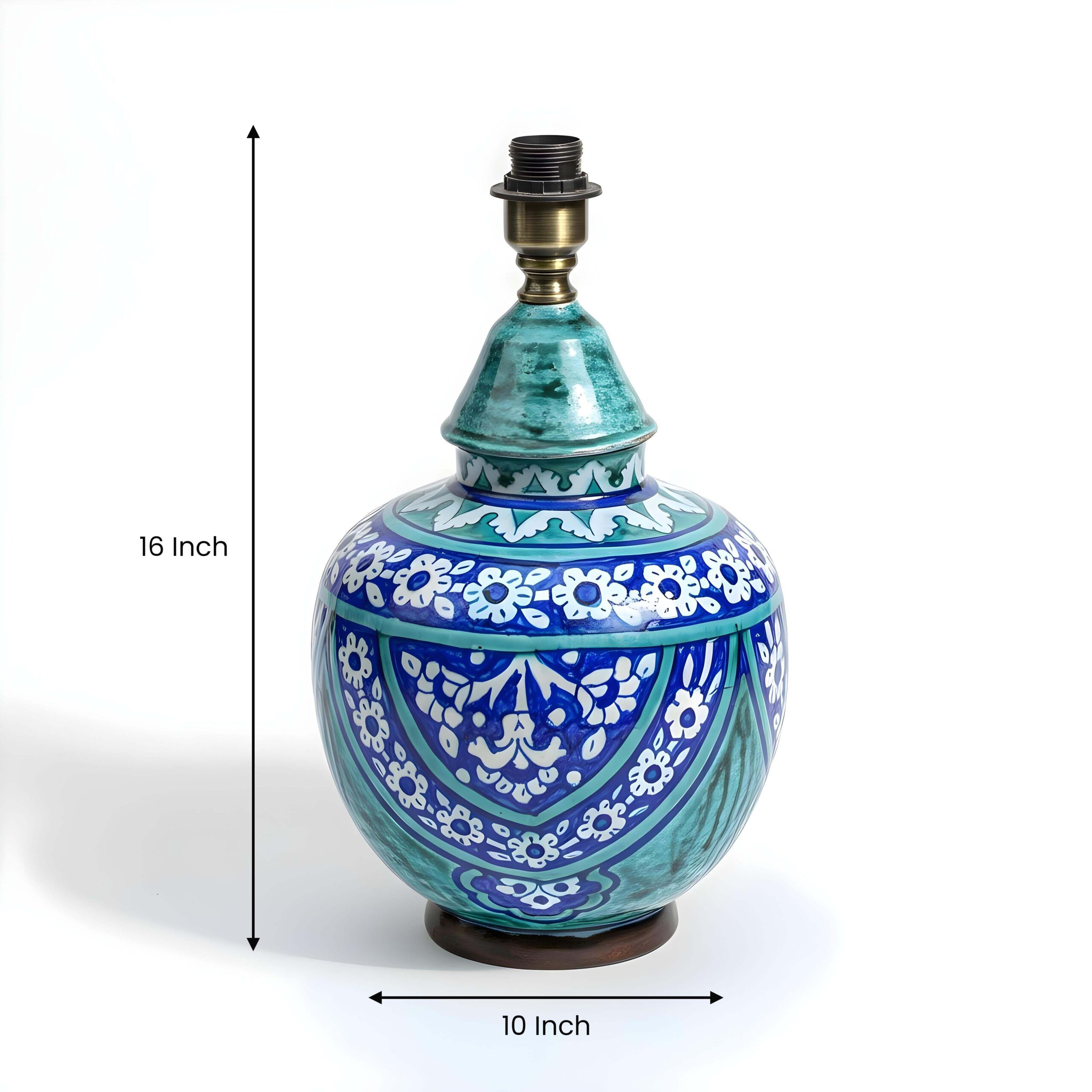 Each lamp base is carefully made and painted by hand. It has a beautiful round shape and is decorated with pretty white and blue flower designs. The mix of deep blue and sea-green colors is very calming and lovely to look at. The lamp sits on a dark wood base that makes the colors pop.
