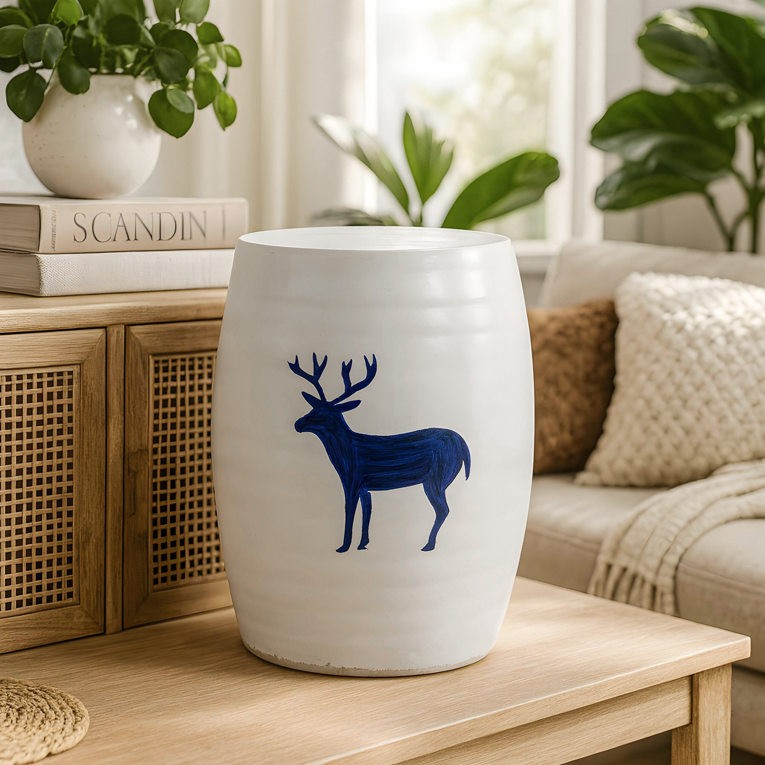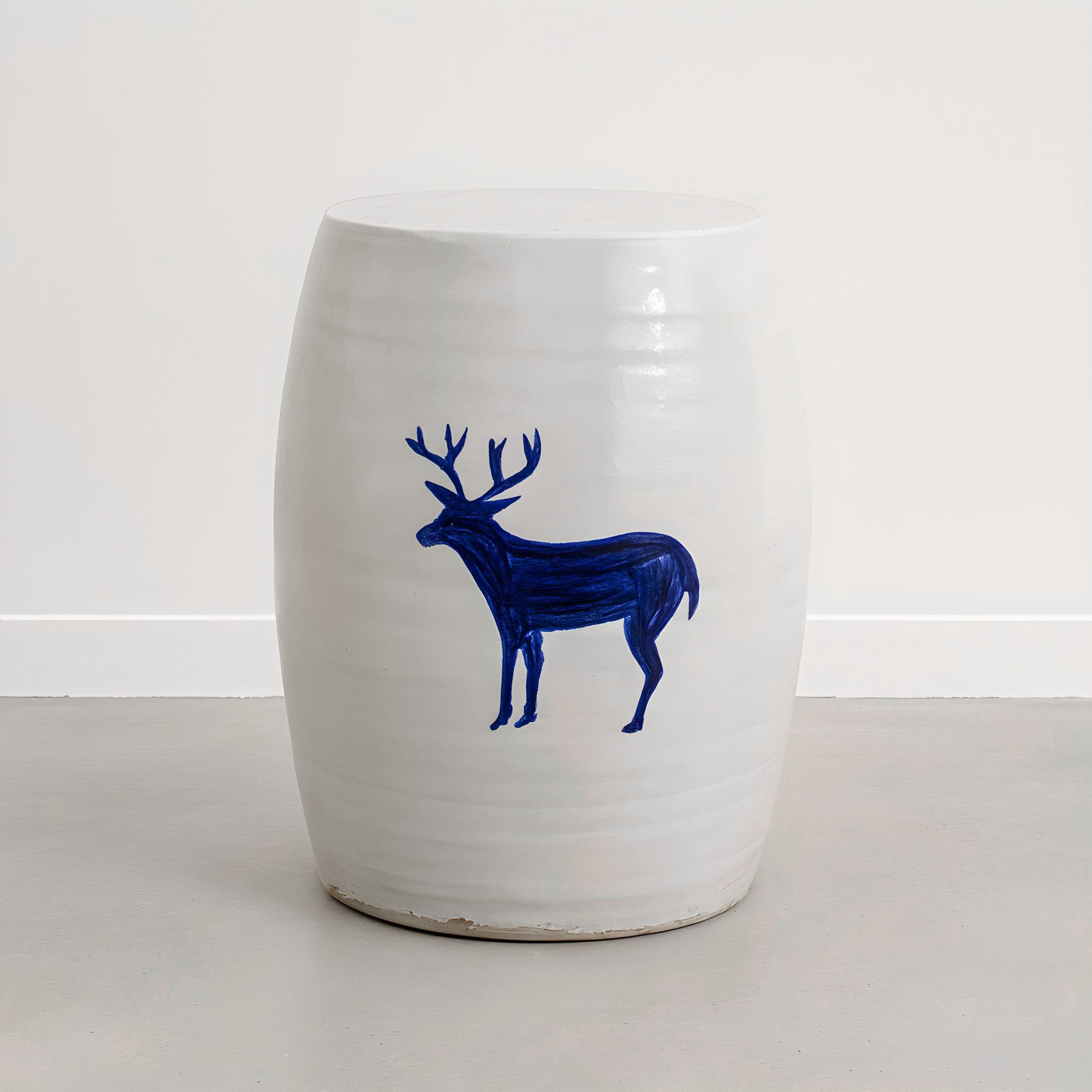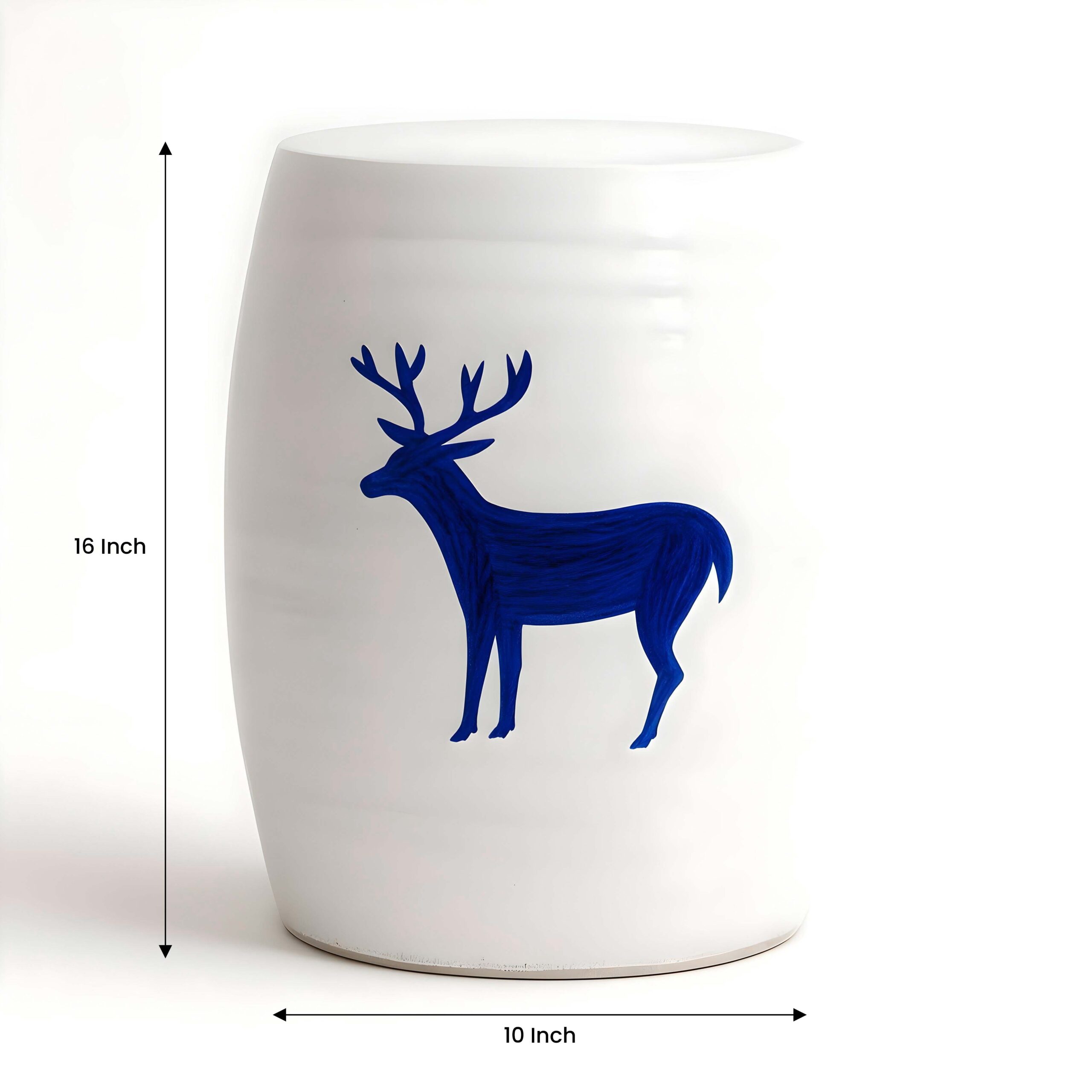 Each table is carefully handmade from strong ceramic, finished with a smooth white glaze that brings out its natural shape. At the center of its design is a bold, hand-painted blue deer that adds a touch of nature and artistic beauty. The unglazed base gives it an authentic, handmade feel.