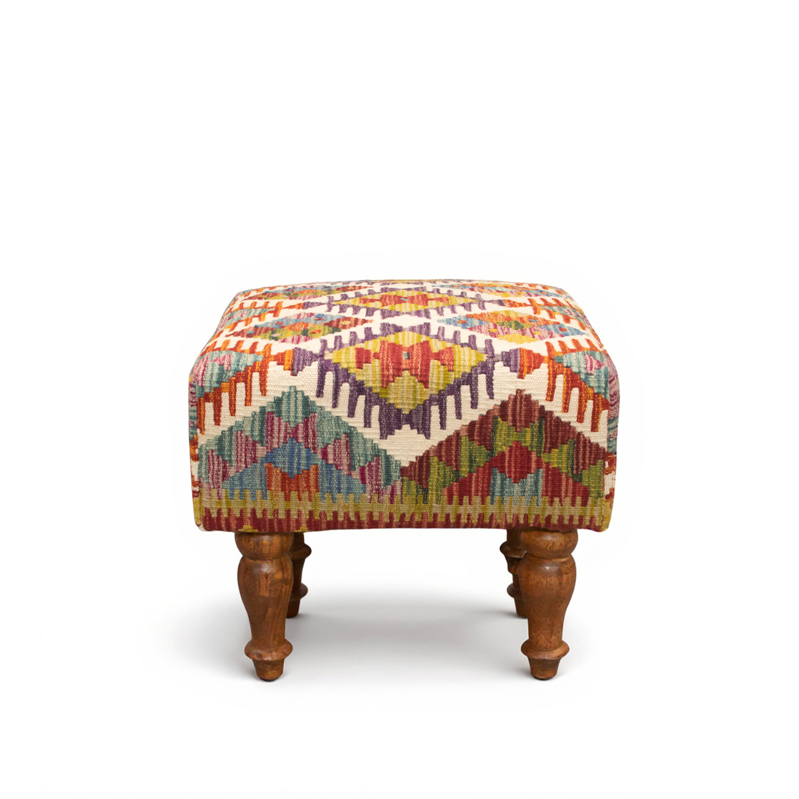 The stool is upholstered with a vibrant and colorful Kilim fabric, a traditional handwoven textile known for its beauty and durability. This stunning pattern makes every stool a unique work of art. This ottoman is more than just a place to rest your feet; it’s a statement piece. The elegant design adds a pop of color and sophisticated style to any room.