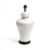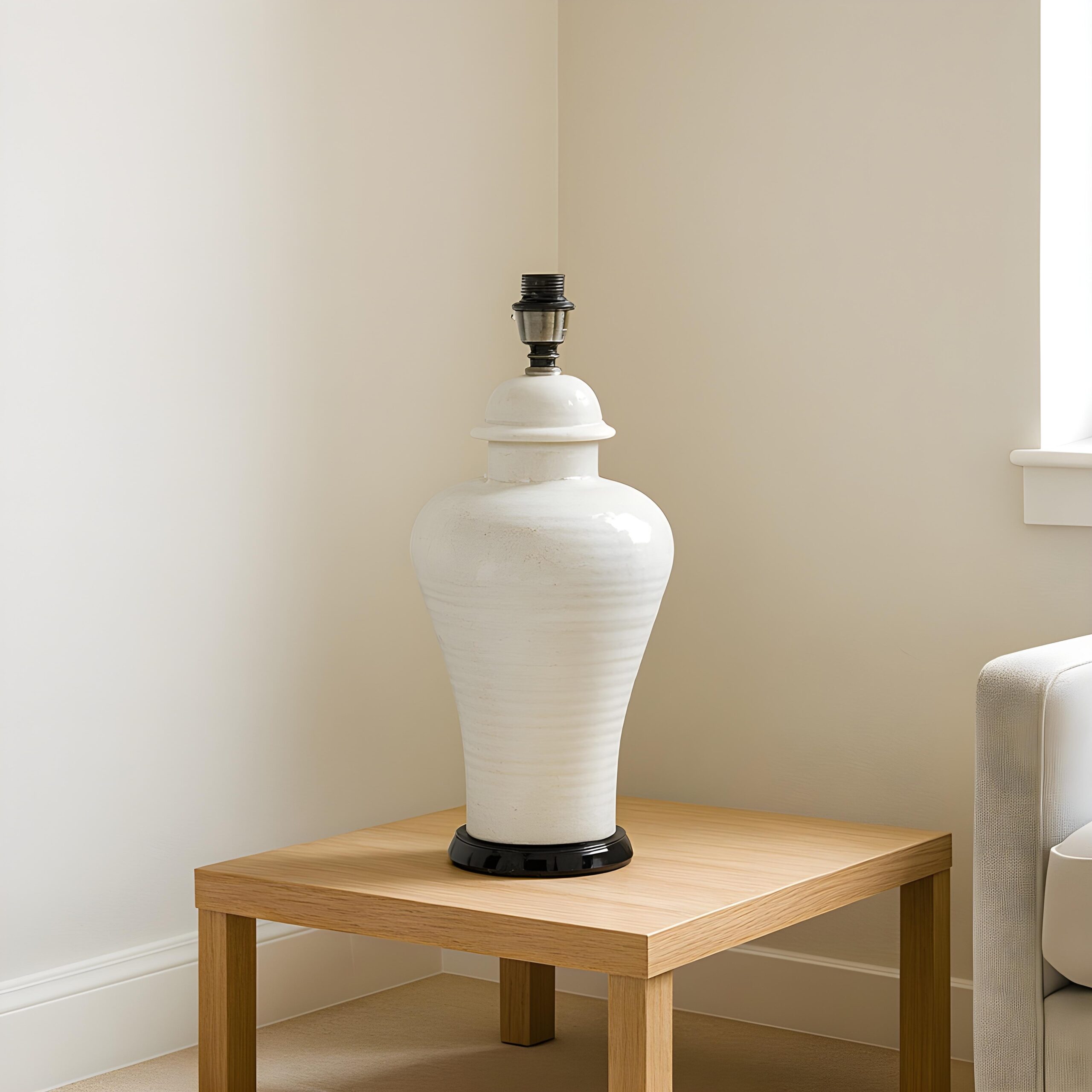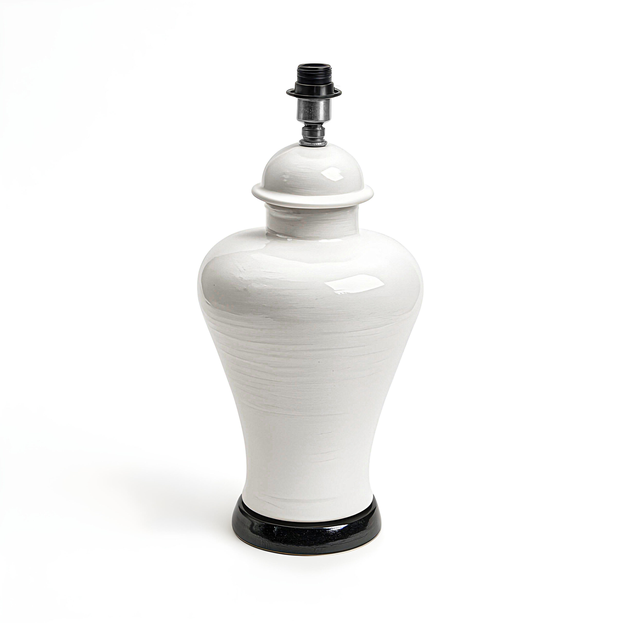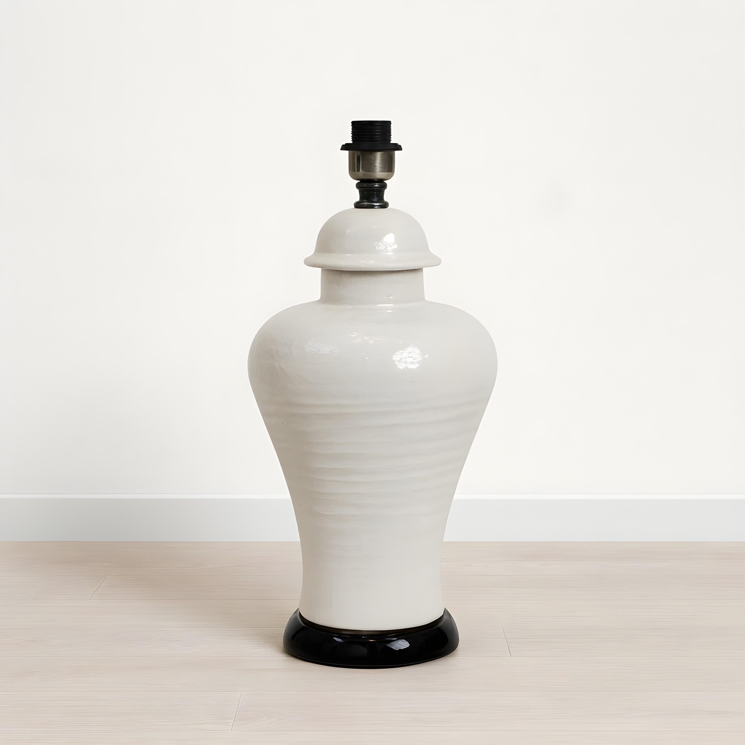 Each lamp base is carefully made by hand from ceramic. It has a tall, graceful shape like a classic jar. You can see soft lines running around the lamp, which show it was made by hand. The lamp has a soft, shiny off-white color and sits on a shiny black base that makes it look very finished and stylish.