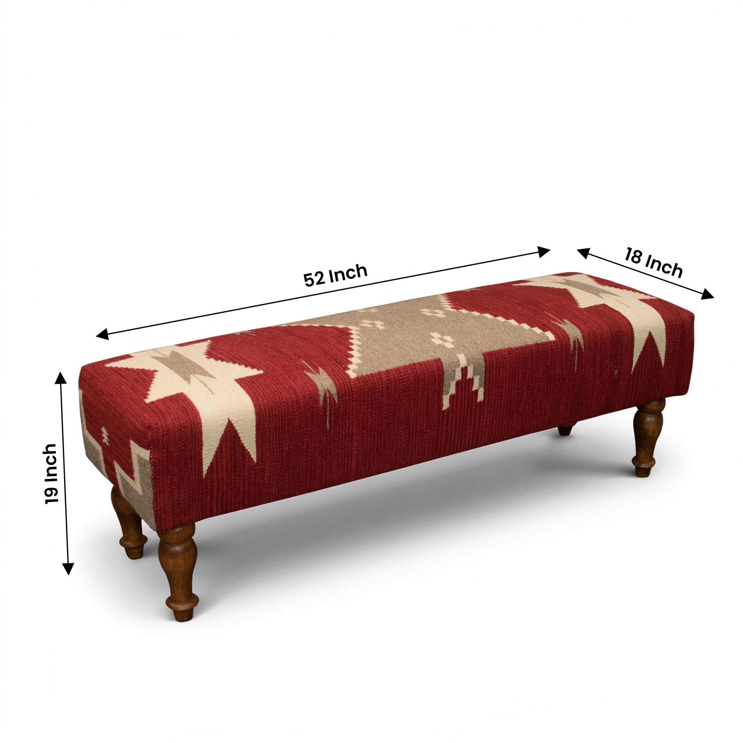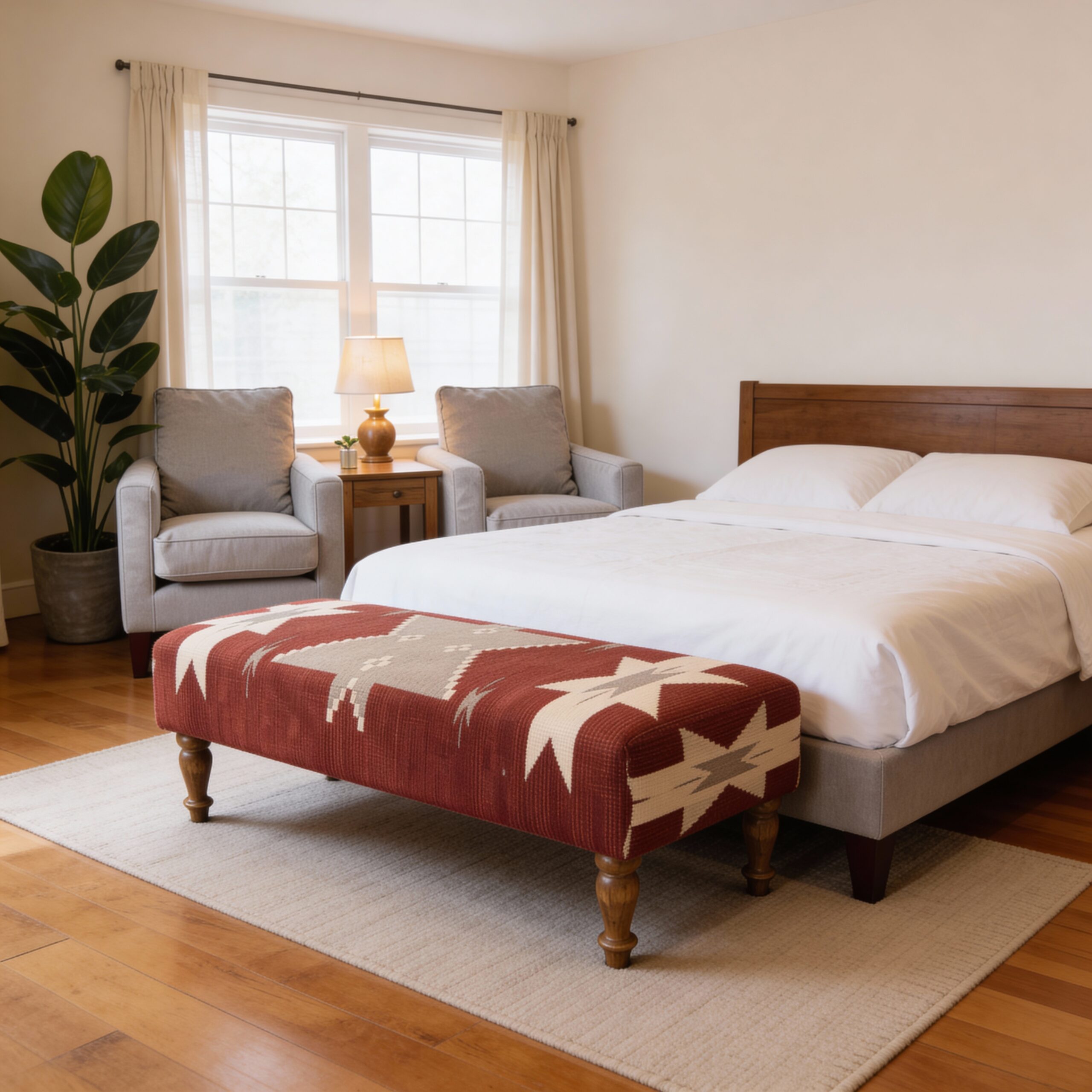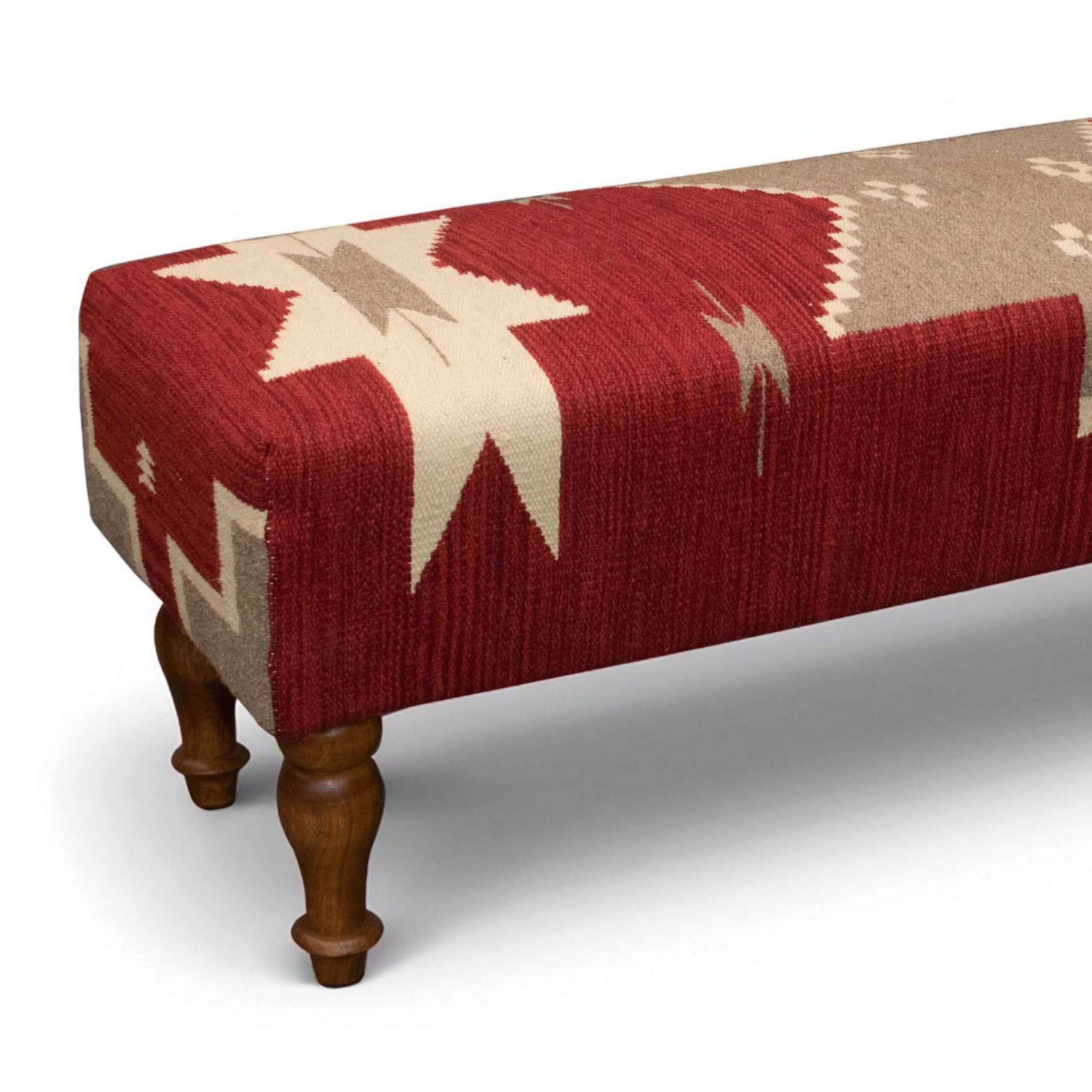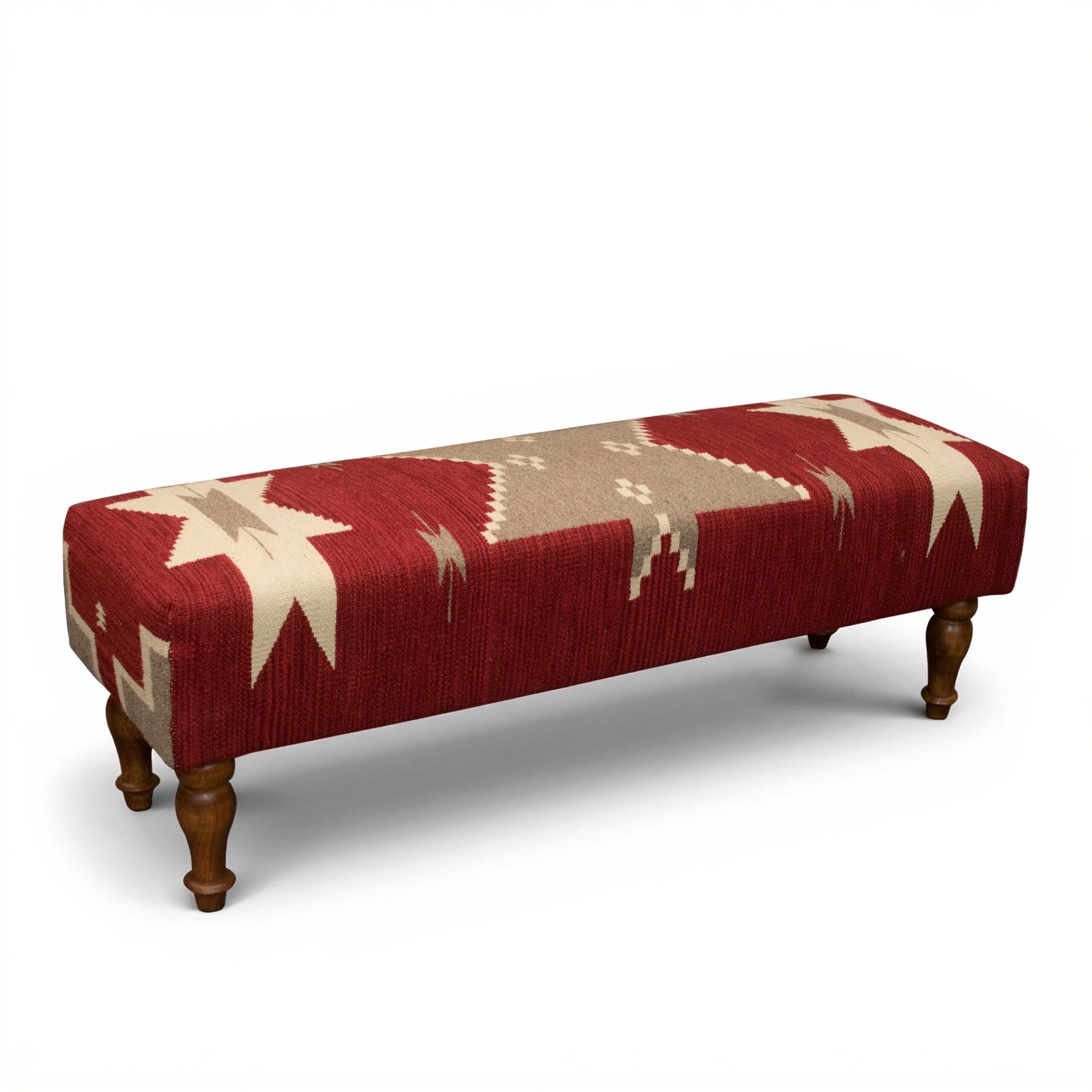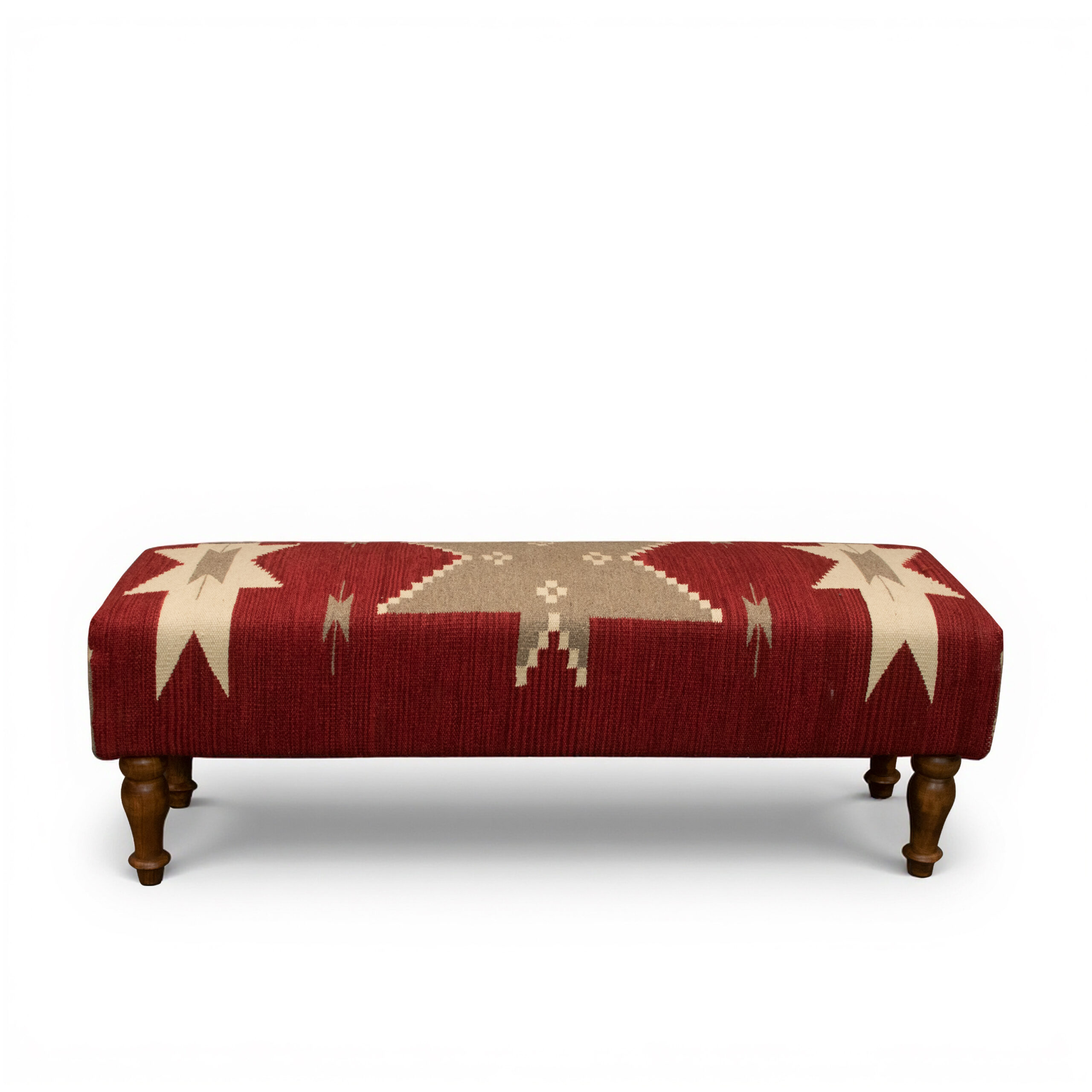 The bench is upholstered in a durable, high-quality rug, featuring a bold geometric star pattern in a rich red, beige, and grey palette. This unique design makes every bench a statement piece. This ottoman is more than just a seat; it’s a piece of functional art that adds warmth, texture, and character to any room.