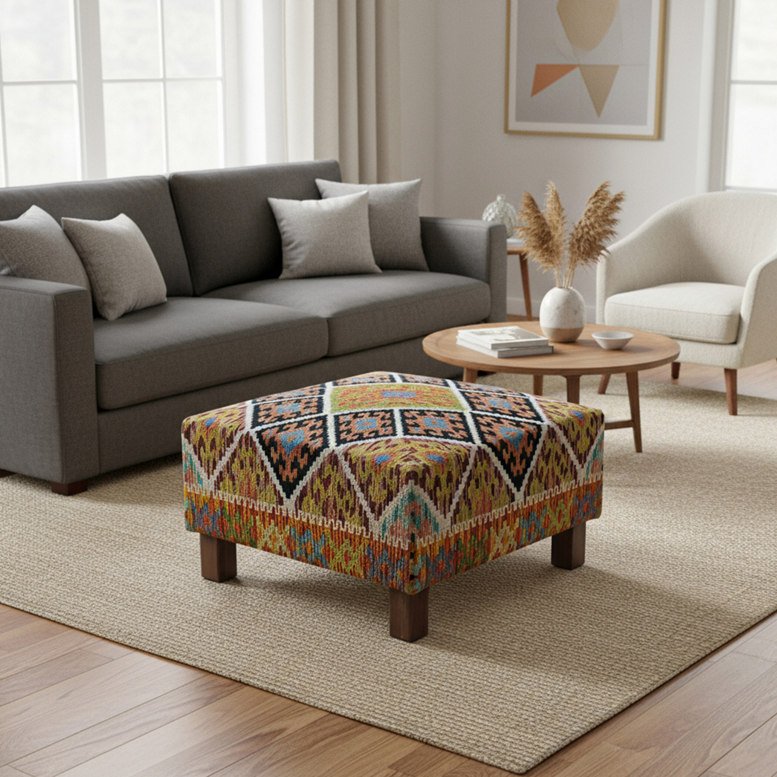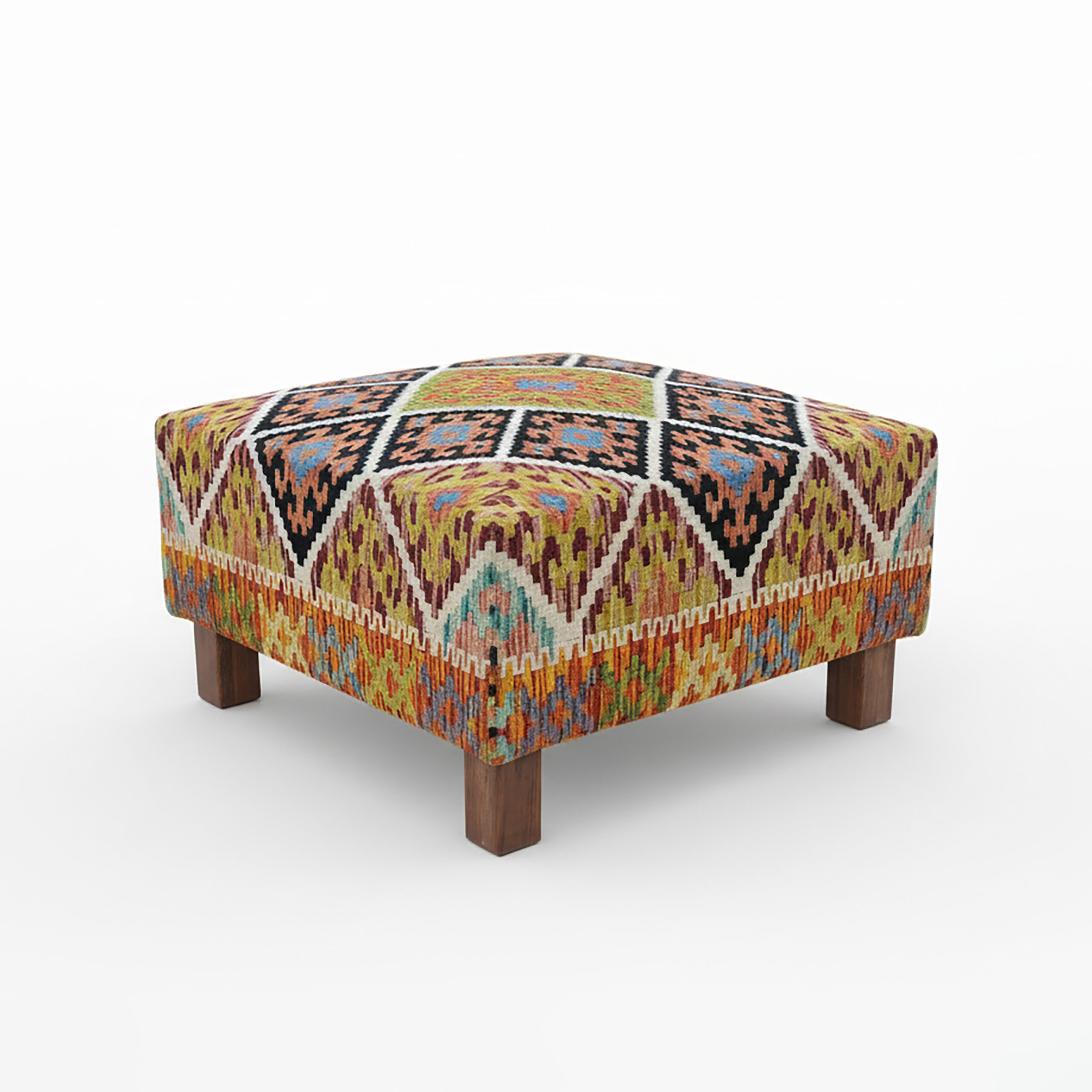 Elevate your home décor with the Wooden Ottoman Stool with Kilim Upholstery by Virsa Homes. Each piece is meticulously crafted with a solid wooden frame and upholstered in vibrant, handwoven Kilim fabric. Its rich, colorful patterns showcase timeless craftsmanship, making it a statement piece for any living room, bedroom, or lounge area.