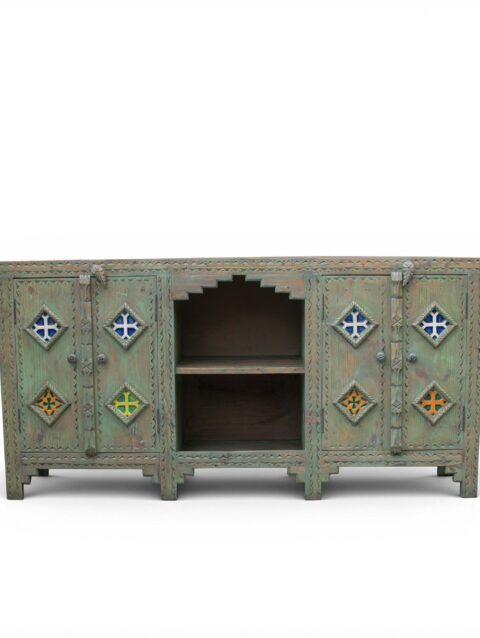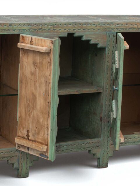 Hand Carved Wooden Media Console with Distressed Green Finish WC-1073