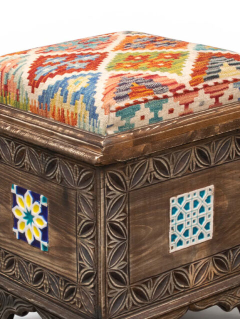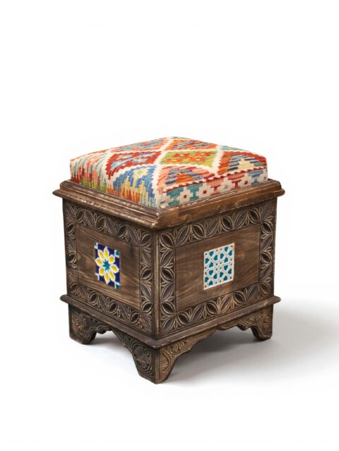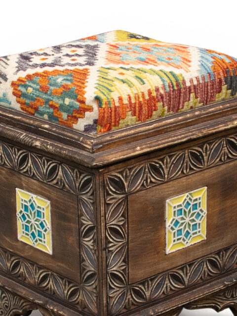 Hand-Carved Wooden Storage Stool With Kilim Upholstery WB-1016